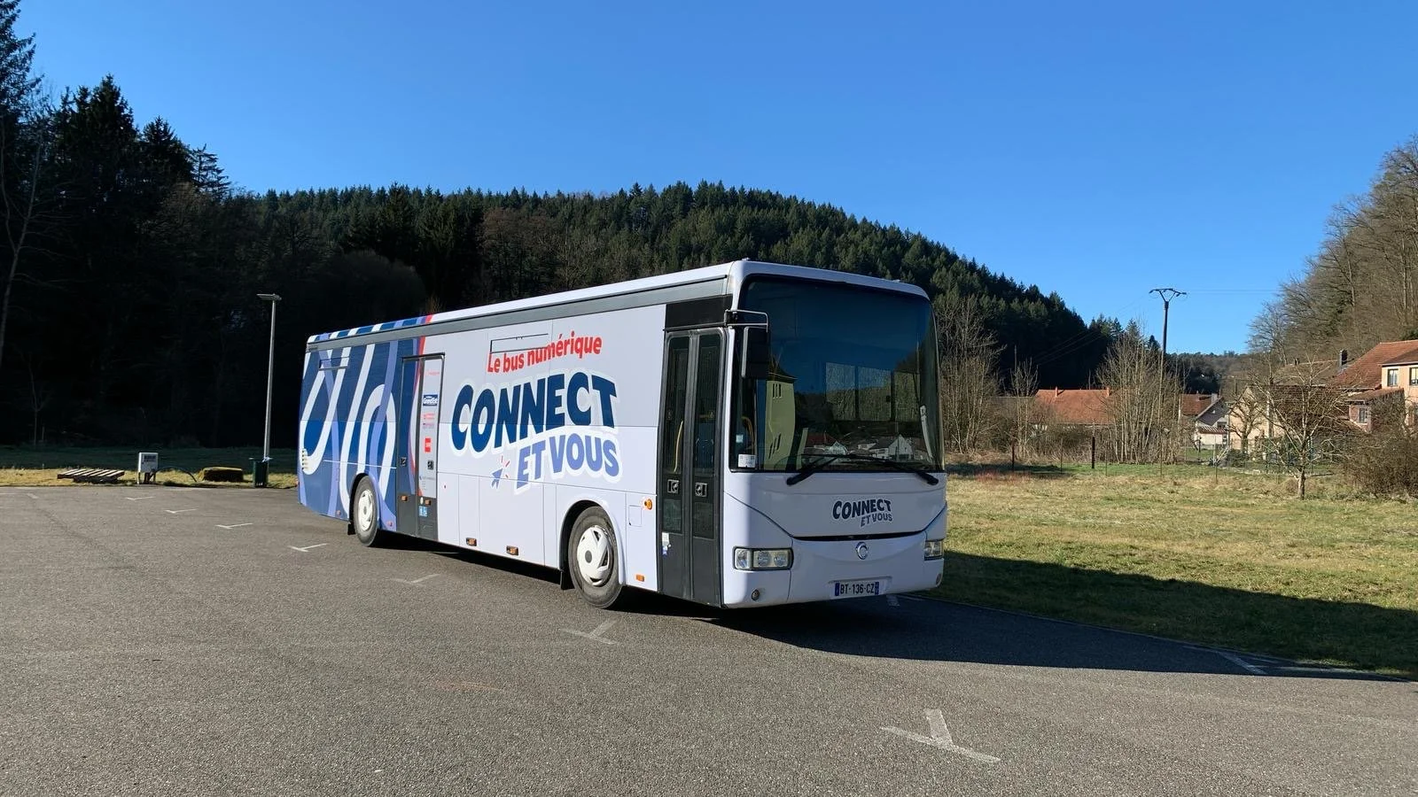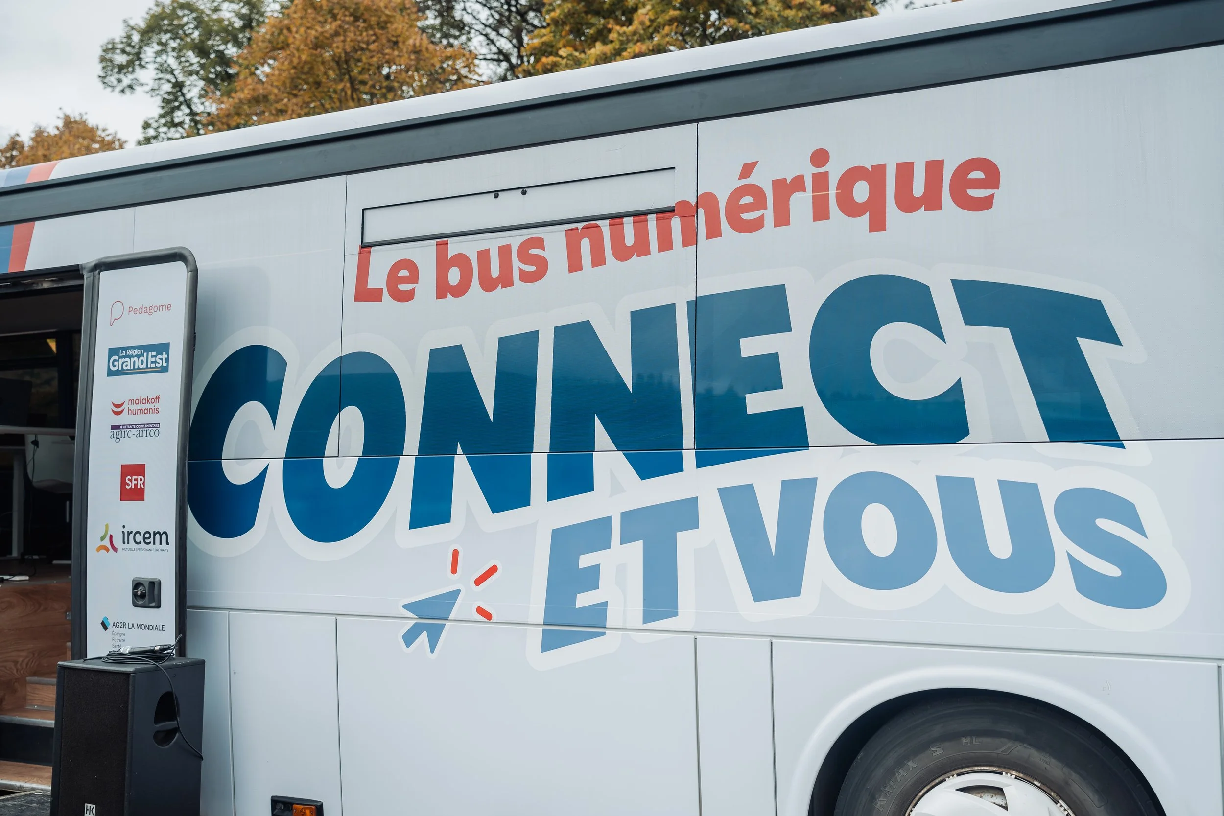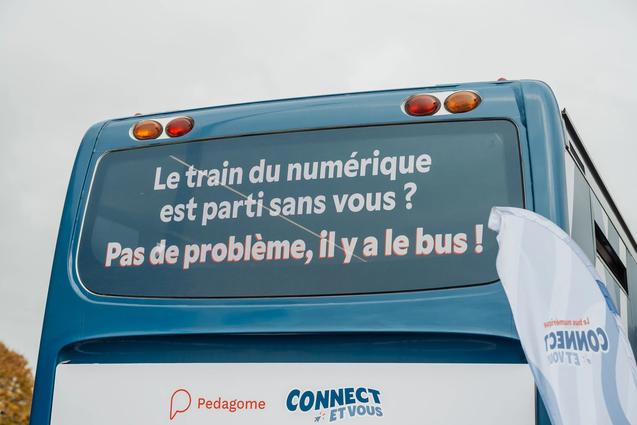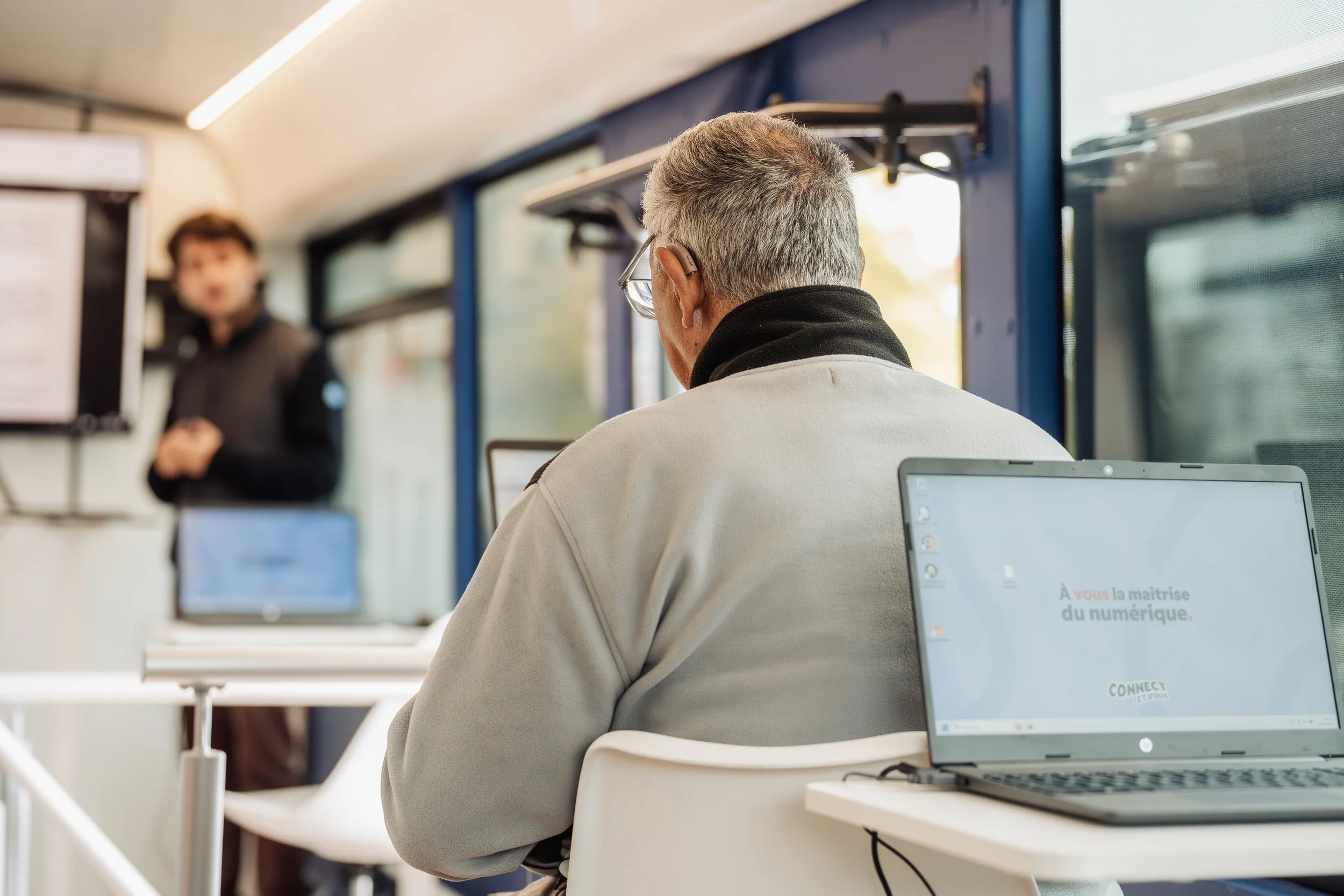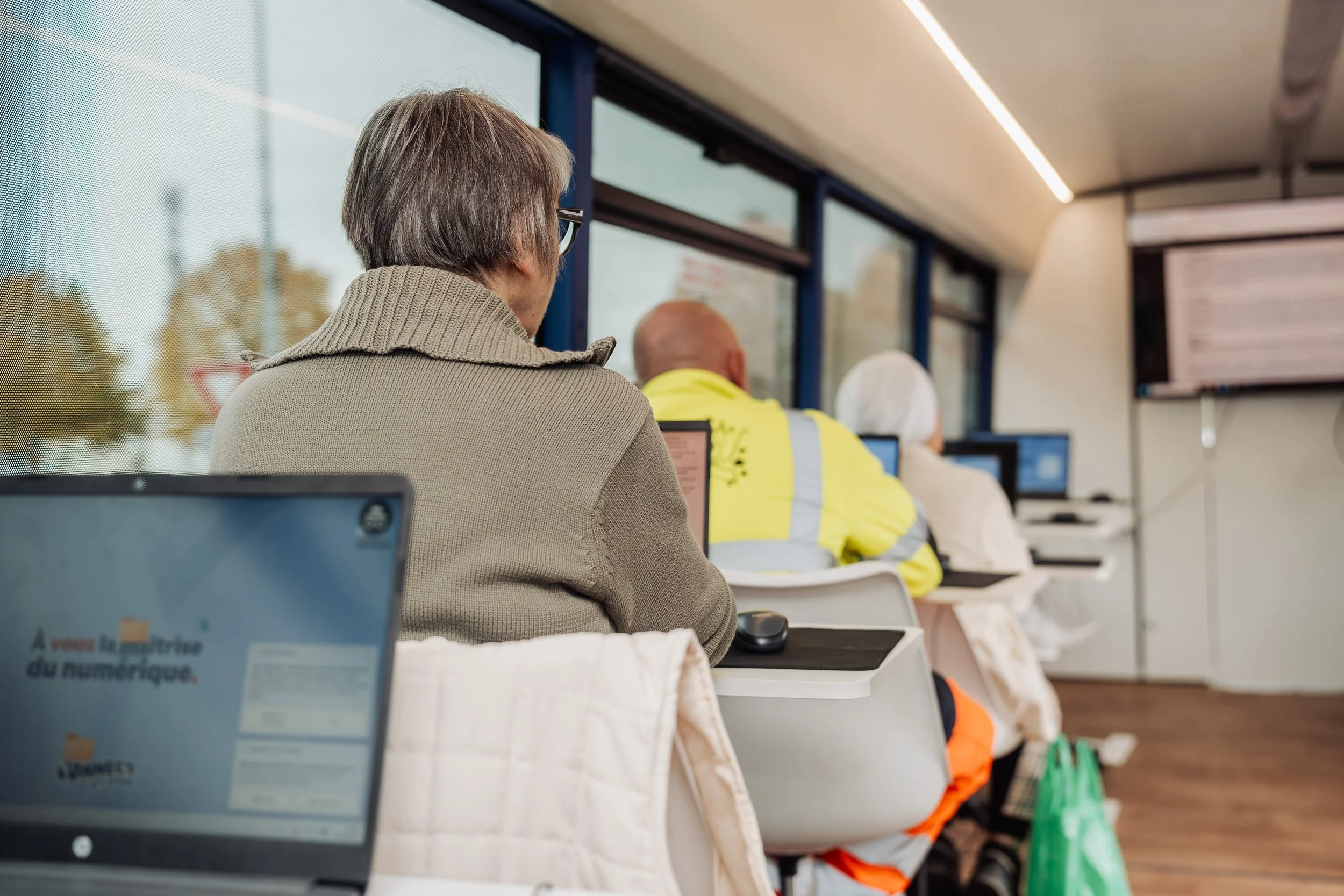 Ce bus, pensé comme une salle de formation mobile, permet d’accompagner des seniors et des personnes en retour à la vie active dans leur apprentissage du digital.